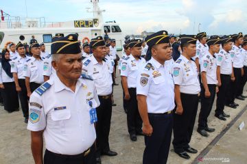 Sejumlah petugas Kepala Kantor Syahbandar dan Otoritas Pelabuhan (KSOP) Kelas II Pontianak mengikuti apel pembukaan Posko Angkutan Laut Lebaran tahun 2019 di Pelabuhan Dwikora Pontianak, Kalimantan Barat, Senin (20/5/2019). Posko Angkutan Laut di Pelabuhan Dwikora yang dibuat KSOP Kelas II Pontianak tersebut turut melibatkan 23 instansi diantaranya Basarnas, Custom Imigrasi Karantina, TNI AL, Kepolisian serta Pelindo yang bertujuan untuk memberikan rasa aman dan nyaman bagi penumpang transportasi laut. ANTARA FOTO/Jessica Helena Wuysang/hp.