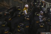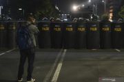 Seorang wartawan mengabadikan sejumlah petugas kepolisian yang melakukan pengawalan saat aksi unjuk rasa oleh massa Gerakan Nasional Kedaulatan Rakyat di depan kantor Bawaslu di kawasan Jalan MH Thamrin, Jakarta, Selasa (21/5/2019). Aksi berjalan tertib, aman dan damai. ANTARA FOTO/Muhammad Adimaja/wsj/pri
