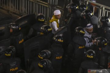 Seorang pengunjuk rasa dari Gerakan Nasional Kedaulatan Rakyat memeluk petugas kepolisian usai melakukan aksi unjuk rasa di depan kantor Bawaslu di kawasan Jalan MH Thamrin, Jakarta, Selasa (21/5/2019). Aksi berjalan tertib, aman dan damai. ANTARA FOTO/Muhammad Adimaja/wsj/pri