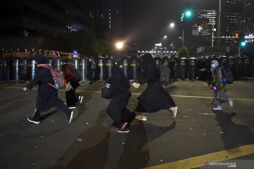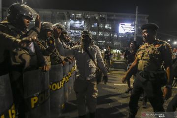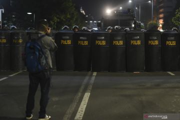 Sejumlah petugas kepolisian mengawal para pengunjuk rasa dari Gerakan Nasional Kedaulatan Rakyat yang membubarkan diri di depan kantor Bawaslu di kawasan Jalan MH Thamrin, Jakarta, Selasa (21/5/2019). Aksi berjalan tertib, aman dan damai. ANTARA FOTO/Muhammad Adimaja/wsj/pri