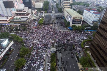 Foto aerial suasana aksi damai di depan kantor Bawaslu, Jalan MH Thamrin, Jakarta Pusat, Selasa (21/5/2019). Aksi tersebut dalam rangka menyikapi hasil rekapitulasi Pemilu 2019 yang telah diumumkan KPU. ANTARA FOTO/Sigid Kurniawan/wsj/pri