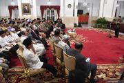 Presiden Joko Widodo (tengah) menyapa santri yang hadir dalam peringatan Nuzulul Quran di Istana Negara, Jakarta, Selasa (21/5/19). Peringatan Nuzulul Quran 1440 Hijriah tersebut menekankan nilai persatuan dalam keberagaman berbangsa dan bernegara. ANTARA FOTO/Puspa Perwitasari/wsj.