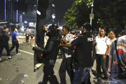 Petugas mengamankan seseorang yang diduga provokator saat petugas membubarkan massa yang masih bertahan di depan kantor Bawaslu di kawasan Thamrin, Jakarta, Rabu (22/5/2019) dini hari. ANTARA FOTO/Muhammad Adimaja/pras.