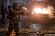 Petugas kepolisian menembakan gas air mata ke arah massa aksi saat terjadi bentrokan di kawasan Tanah Abang, Jakarta, Rabu (22/5/2019). ANTARA FOTO/Muhammad Adimaja/pras.