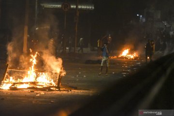 Massa melakukan pembakaran saat mencoba melawan petugas kepolisian di kawasan Tanah Abang, Jakarta, Rabu (22/5/2019). ANTARA FOTO/Muhammad Adimaja/pras.