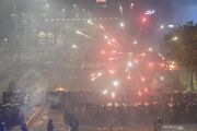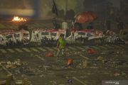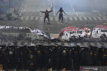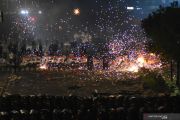 Sejumlah massa aksi terlibat kericuhan di depan gedung Bawaslu, Jakarta, Rabu (22/5/209). Aksi unjuk rasa itu dilakukan menyikapi putusan hasil rekapitulasi nasional Pemilu serentak 2019. ANTARA FOTO/Nova Wahyudi/pras.