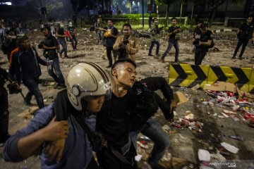 Personel kepolisian membantu rekannya yang terluka saat mengamankan Aksi 22 Mei yang ricuh di depan kantor Bawaslu, Jakarta, Rabu (22/5/2019). ANTARA FOTO/Dhemas Reviyanto/pras.