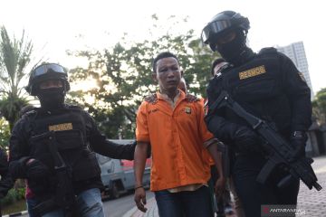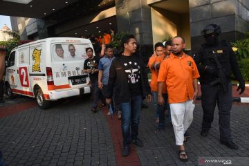 Petugas membawa tersangka pelaku kericuhan dalam aksi 22 Mei dalam rilis di Mapolda Metro Jaya, Jakarta, Kamis (23/5/2019). Selain menangkap sejumlah tersangka, Polisi juga mengamankan satu buah ambulan yang diduga disalahgunakan untuk membawa batu. ANTARA FOTO/Akbar Nugroho Gumay/hp.