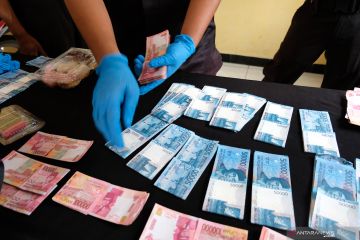 Polisi menunjukkan barang bukti uang kertas palsu saat gelar perkara uang palsu di Mapolsek, Kertek, Wonosobo, Jawa Tengah Sabtu (25/5/2019). Tim Satreskrim Polres Wonosobo berhasil meringkus dua tersangka sindikat pengedar uang palsu pecahan 50.000 dan 100.000 senilai Rp37.400.000 berinisial AW dan HH dan masih memburu seorang tersangka lain berinisial H. FOTO ANTARA/Anis Efizudin/hp.