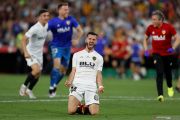 Pesepak bola Valencia Ezequiel Garay (tengah) melakukan selebrasi setelah tim nya mengalahkan Barcelona dalam laga final Copa Del Rey, di Stadion Estadio Benito Villamarin, Sevilla, Spanyol, Sabtu (25/5/2019). Valencia menjuarai Copa Del Rey setelah mengalahkan Barcelona 2-1. ANTARA FOTO/Reuter-Marcelo del Pozo/hp.