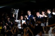 Pesepak bola Valencia Dani Parejo melakukan selebrasi seraya memegang Piala Copa del Rey di sbelah Raja Spanyol Felipe VI usai pertandingan melawan Barcelona, di Stadion Estadio Benito Villamarin, Sevila, Spanyol, Sabtu (25/5/2019). Valencia mengalahkan Barcelona di babak final Copa Del Rey 2-1. ANTARA FOTO/Reuter-Marcelo del Pozo/hp.