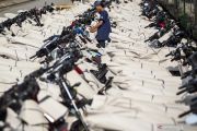 Pekerja merapikan susunan sepeda motor pemudik sebelum diangkut menggunakan jasa pengiriman kereta api di Stasiun Jakarta Gudang, Jakarta, Senin (27/5/2019). Direktorat Lalu Lintas dan Angkutan Kereta Api Kementerian Perhubungan menggelar layanan angkutan Motor Gratis (Motis) dengan moda kereta api untuk 18.096 motor pemudik Lebaran 2019 yang berlangsung hingga 2 Juni mendatang. ANTARA FOTO/Dhemas Reviyanto/wsj.