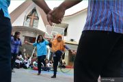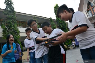 Guru SD bermain bersama anak didik dalam kegiatan Ramadhan Warna-Warni di SD Petra Jombang, Jawa Timur, Senin (27/5/2019). Kegiatan diselenggarakan oleh Jaringan Sekolah Pancasila diikuti oleh siswa SD Kristen Petra, SD Katolik Wijana, SD Negeri Grogol 2, dan MI Islamiyyah Plosogenuk Jombang diselengarakan agar menumbuhkan sikap toleransi terhadap keberagaman. ANTARA FOTO/Syaiful Arif/foc.