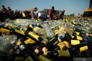 Petugas menggunakan alat berat memusnahkan ribuan botol minuman keras (miras) di Lapangan Kalibliruk, Polres Tegal, Jawa Tengah, Selasa (28/5/2019). Sebanyak 10.316 botol miras dan 280 liter oplosan hasil operasi selama satu bulan di sejumlah warung dimusnahkan, untuk menjaga keamanan dan kenyamanan jelang Lebaran. ANTARA FOTO/Oky Lukmansyah/foc.