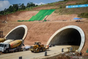 Alat berat melintasi terowongan jalan tol Cisumdawu di Pamulihan, Kabupaten Sumedang, Jawa Barat, Selasa (28/5/2019). Pemerintah Provinsi Jawa Barat bersama Dinas Perhubungan akan membuka sebagian ruas Jalan Tol Cisumdawu sepanjang 5 kilometer secara fungsional untuk kendaraan kecil pada arus mudik Lebaran 2019 bagi pemudik yang akan menuju Subang, dan Cirebon via Sumedang Utara. ANTARA FOTO/Raisan Al Farisi/foc.