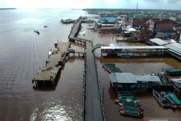 Foto udara dermaga Pelabuhan Kuatik dan Pelabuhan LLASDP Kuala Tungkal yang mulai dipadati antrean kapal cepat di Tanjungjabung Barat, Jambi, Selasa (28/5/2019). Kawasan pelabuhan setempat mulai dipadati antrean kapal cepat dan warga yang ingin mudik, sementara Dinas Perhubungan Kabupaten Tanjungjabung Barat memprediksi puncak arus mudik laut daerah itu terjadi pada Sabtu (1/6) dan Minggu (2/6). ANTARA FOTO/Wahdi Septiawan/foc.