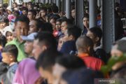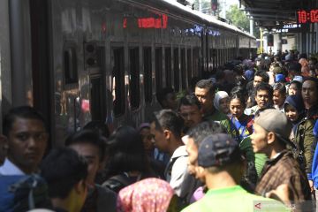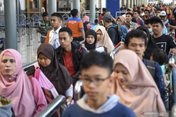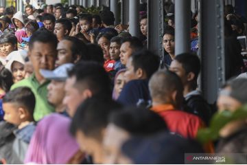 Calon penumpang KA Serayu tujuan Purwokerto mengantre masuk ke dalam Stasiun Pasar Senen, Jakarta, Kamis (30/5/2019). Direktorat Jenderal Perkeretaapian Kemenhub memprediksi pemudik yang menggunakan jasa angkutan kereta api mengalami peningkatan pada 29 Mei hingga 4 Juni dengan puncak arus mudik pada Jumat, 31 Mei. ANTARA FOTO/Hafidz Mubarak A/wsj.