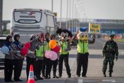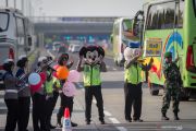 Anggota Polisi Polres Karanganyar memakai kostum tokoh kartun dan membawa balon melambaikan tangan kepada pengendara mobil di Pintu Gerbang Tol Colomadu, Ngasem, Karanganyar, Jawa Tengah, Jumat (31/5/2019). Kegiatan tersebut untuk menghibur pemudik sekaligus himbauan kepada pemudik agar senantiasa berhati-hari dan mengutamankan keselamatan saat berkendara. ANTARA FOTO/Mohammad Ayudha/hp.