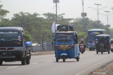 Pemudik pengguna bajaj melintas di jalur Pantura Arjawinangun, Cirebon, Jawa Barat, Sabtu (1/6/2019). Memasuki H-4 Lebaran, arus mudik di jalur Pantura Cirebon terpantau lancar. ANTARA FOTO/Dedhez Anggara/ama.