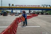 Petugas menyiapkan rambu lalu lintas guna pemberlakukan satu jalur (one way) di Tol Trans Jawa Km 414 Gerbang Tol Kalikangkung, Semarang, Jawa Tengah, Jumat (7/6/2019). Pada H+2 lebaran, Korlantas Polri memberlakukan kebijakan satu jalur (one way) mulai Jumat (7/6/2019) pukul 14:00 WIB untuk kendaraan dari arah Jateng menuju Jakarta yang dimulai dari gerbang tol tersebut hingga Km 70 Gerbang Tol Cikampek Utama yang rencananya akan diberlakukan hingga Minggu (10/6/2019). ANTARA FOTO/Aji Styawan/hp.