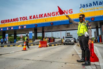 Petugas polisi berjaga saat pemberlakukan satu jalur (one way) di Tol Trans Jawa Km 414 Gerbang Tol Kalikangkung, Semarang, Jawa Tengah, Jumat (7/6/2019). Pada H+2 lebaran, Korlantas Polri memberlakukan kebijakan satu jalur (one way) mulai Jumat (7/6/2019) pukul 14:00 WIB untuk kendaraan dari arah Jateng menuju Jakarta yang dimulai dari gerbang tol tersebut hingga Km 70 Gerbang Tol Cikampek Utama yang rencananya akan diberlakukan hingga Minggu (10/6/2019). ANTARA FOTO/Aji Styawan/hp.