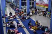 Penumpang KMP Mutiara Persada II beristirahat menunggu kepastian dari pihak Kapal di Ruang Tunggu Pelabuhan Bakauheni Lampung Selatan, Lampung, Jumat (7/6/2019). Para penumpang KMP Mutiara Persada II terlantar karena kendaraan meraka masih berada di dalam kapal yang karam di pulau Rimau Balak saat menuju pelabuhan Bakauheni Lampung Selatan. ANTARA FOTO/Ardiansyah/hp.