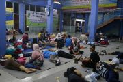 Penumpang KMP Mutiara Persada II beristirahat menunggu kepastian dari pihak Kapal di Ruang Tunggu Pelabuhan Bakauheni Lampung Selatan, Lampung, Jumat (7/6/2019). Para penumpang KMP Mutiara Persada II terlantar karena kendaraan mereka masih berada di dalam kapal yang karam di pulau Rimau Balak saat menuju pelabuhan Bakauheni Lampung Selatan. ANTARA FOTO/Ardiansyah/hp.