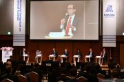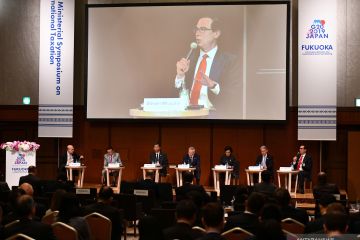 Menteri Keuangan AS Steven Mnuchin (kanan) memberikan sambutan, sementara Menteri Keuangan Sri Mulyani Indrawati (ketiga kanan) dan Menteri Keuangan lainnya mendengarkan, dalam Simposium yang membahas Pajak Internasional pada Pertemuan G20 tingkat Menteri Keuangan dan Gubernur Bank Nasional, di Fukuoka, Jepang, Sabtu (8/6/2019). ANTARA FOTO/Reuters/Toshifumi Kitamura/Pool/ama.