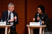Menteri Keuangan Sri Mulyani Indrawati (kanan) memberikan sambutan, disaksikan Menteri Ekonomi dan Keuangan Perancis Bruno Le Maire, dalam Simposium yang membahas Pajak Internasional pada Pertemuan G20 tingkat Menteri Keuangan dan Gubernur Bank Nasional, di Fukuoka, Jepang, Sabtu (8/6/2019). ANTARA FOTO/Reuters/Toshifumi Kitamura/Pool/ama.