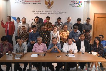 Wakil Ketua TKN Asrul Sani (tengah) didampingi Direktur Program Ario Bimo (kiri) dan Direktur Hukum dan Advokasi Ade Irfan Pulungan (kanan) bersiap menyampaikan keterangan terkait kesiapan TKN menghadapi proses sengketa pilpres di Jakarta, Senin (10/6/2019). TKN menyatakan siap menghadapi gugatan paslon nomor urut 02 Prabowo-Sandi pada sidang perdana tanggal 14 Juni 2019. ANTARA FOTO/Akbar Nugroho Gumay/hp.