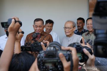 Menteri Pertahanan (Menhan) Ryamizard Ryacudu (kiri) menjawab pertanyaan wartawan seusai bersilaturahmi di kediaman mantan Ketua Umum PP Muhammadiyah, Ahmad Syafii Maarif atau Buya Syafii (ketiga kanan), di Nogotirto, Gamping, Sleman, DI Yogyakarta, Selasa (11/6/2019). Dalam pertemuan tertutup selama hampir 2 jam itu Ryamizard Ryacudu dan Buya Syafii membahas masalah agama. ANTARA FOTO/Andreas Fitri Atmoko/ama.