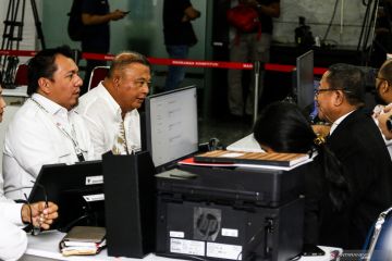 Direktur Advokasi dan Hukum Tim Kampanye Nasional (TKN) Ade Irfan Pulungan (kiri) didampingi Wakil Direktur Hukum dan Advokasi TKN Hermawi Taslim (kanan) berdiskusi dengan petugas registrasi di Gedung Mahkamah Konstitusi, Jakarta, Selasa (11/6/2019). Tim Advokasi dan Hukum TKN mendaftarkan 33 kuasa hukum untuk menghadapi gugatan Perselisihan Hasil Pemilihan Umum (PHPU) 2019. ANTARA FOTO/Rivan Awal Lingga/foc.