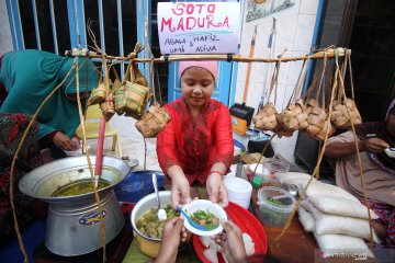 Seorang bocah melayani warga yang ingin menikmati hidangan ketupat gratis di Kampung Sukolilo, Kenjeran, Surabaya, Jawa Timur, Rabu (12/6/2019). Tradisi Lebaran Ketupat yang dirayakan pada hari ketujuh setelah Hari Raya Idul Fitri di kampung tersebut dimeriahkan dengan membagikan hidangan ketupat secara gratis kepada warga lainnya sebagai ungkapan rasa syukur dan mempererat persaudaraan. ANTARA FOTO/Moch Asim/aww.