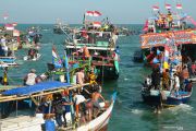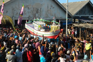 Warga mengikuti prosesi Pesta Lomban di Pantai Kartini, Jepara, Jateng, Rabu (12/6/2019). Pesta Lomban yang diadakan sepekan setelah Idul Fitri dengan melarung sesaji berupa kepala kerbau serta hasil bumi ke tengah laut itu merupakan ungkapan syukur dan harapan para nelayan kepada Tuhan atas limpahan rezeki dan keselamatan saat melaut. ANTARA FOTO/Yusuf Nugroho/aww.