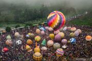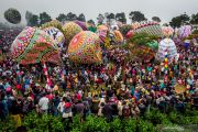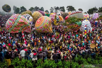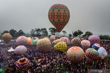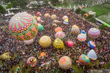 Peserta mengikuti Festival Balon Tradisional 2019 di Desa Pagerejo, Kertek, Wonosobo, Jawa Tengah, Sabtu (15/6/2019). Festival kerjasama antara AirNav Indonesia dengan pemerintah daerah setempat itu diikuti 116 kelompok peserta. Selain menjaga tradisi dan daya tarik wisata, festival tersebut juga menjadi edukasi menerbangkan balon udara yang aman dengan cara ditambatkan di tanah agar tidak mengganggu lalu lintas udara. ANTARA FOTO/Aji Styawan/pras.