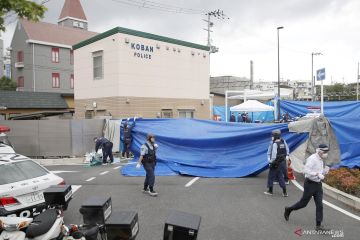 Polisi melakukan olah tempat kejadian perkara kasus penikaman petugas kepolisian dan pencurian senjata dan pelurunya di sebuah pos polisi di Suita, prefektur Osaka, Jepang bagian barat, Minggu (16/6/2019). ANTARA FOTO/KYODO via REUTERS/wsj.