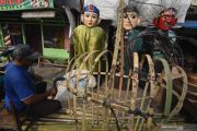 Perajin membuat rangka ondel-ondel pesanan pembeli di kawasan Utan Panjang, Jakarta, Minggu (16/6/2019). Menjelang HUT ke-492 Jakarta pada 22 Juni mendatang, permintaan ondel-ondel di kawasan itu meningkat hingga 15-20 pasang dengan harga jual yang ditawarkan Rp1,2 juta - Rp3,5 juta tergantung ukuran dan bahan pakaiannya. ANTARA FOTO/Indrianto Eko Suwarso/pras.
