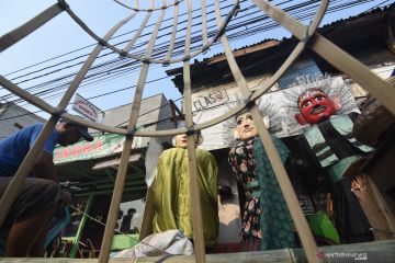 Perajin membuat rangka ondel-ondel pesanan pembeli di kawasan Utan Panjang, Jakarta, Minggu (16/6/2019). Menjelang HUT ke-492 Jakarta pada 22 Juni mendatang, permintaan pesanan ondel-ondel meningkat hingga 15-20 pasang dengan harga jual yang ditawarkan Rp1,2 juta - Rp3,5 juta tergantung ukuran dan bahan pakaiannya. ANTARA FOTO/Indrianto Eko Suwarso/pras.