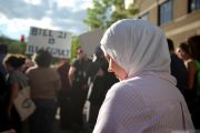 Seorang perempuan mengikuti unjuk rasa memprotes RUU 21 Quebec, yang akan melarang guru, polisi, pengacara pemerintah dan profesi lainnya dalam posisi otoritas untuk mengenakan simbol agama seperti penutup kepala Muslim seperti hijab dan Sikh turban di Montreal, Quebec, Kanada, Senin (17/6/2019) waktu setempat. Provinsi Quebec, Kanada, berencana mengesahkan RUU 21 Quebec yang melarang pemakaian simbol agama untuk karyawan sektor publik selama jam kerja. ANTARA FOTO/REUTERS/Christinne Muschi/wsj.