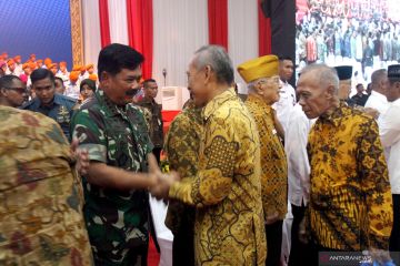 Panglima TNI Marsekal TNI Hadi Tjahjanto (kiri) berjabat tangan dengan sejumlah purnawirawan TNI saat acara halalbihalal di Mabes TNI, Cilangkap, Jakarta Timur, Rabu (19/6/2019). Acara tersebut merupakan ajang silaturahmi Panglima serta prajurit dengan purnawirawan TNI pascalebaran. ANTARA FOTO/Yulius Satria Wijaya/wsj.