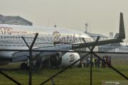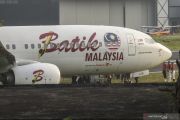 Petugas memeriksa pesawat Maskapai Malindo Air (Batik Malaysia) yang keluar dari landas pacu di Bandara Internasional Husein Sastranegara, Bandung, Jawa Barat, Kamis (20/6/2019). Sebanyak 114 penumpang dan delapan kru pesawat berhasil dievakuasi dengan selamat dan aman setelah maskapai penerbangan bernomor OD-301 yang beroperasi dengan Boeing 737-800NG tujuan Bandung - Kuala Lumpur tersebut tergelincir keluar landas pacu saat berbelok sebelum lepas landas. ANTARA FOTO/Novrian Arbi/wsj.