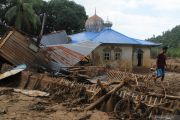 Warga berjalan melintas dijalan yang tertumpuk material rumah yang terbawa banjir disamping masjid di Desa Tapowatu, Kecamatan Asera, Konawe Utara, Sulawesi Tenggara, Sabtu (22/6/2019). Desa Tapowatu merupakan wilayah paling parah akibat dampak banjir yang terjadi Jumat (7/6/2019) yang menyebabkan 85 unit rumah tersapu banjir sementara warga yang berdampak hingga kini masih mengungsi di Posko 2 Kabupaten Konawe Utara. ANTARA FOTO/Jojon/hp.