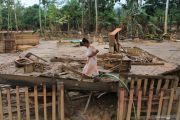 Warga berjalan di depan rumah yang hilang akibat dibawa arus banjir di Desa Walalindu, Kecamatan Asera, Konawe Utara, Sulawesi Tenggara, Sabtu (22/6/2019). Desa Walalindu merupakan kedua wilayah paling parah akibat dampak banjir yang terjadi Jumat (7/6/2019) yang menyebabkan 28 unit rumah terendam 6 unit rumah tersapu banjir sementara warga yang berdampak hingga kini masih mengungsi di Posko 2 Kabupaten Konawe Utara. ANTARA FOTO/Jojon/hp.
