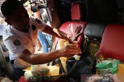 Seorang petugas kepolisian membongkar jok mobil tempat menyembunyikan barang bukti sabu-sabu 15 kilogram saat gelar perkara di halaman Polres Metro Jakarta Utara . ANTARA/Fianda Rassat/aa