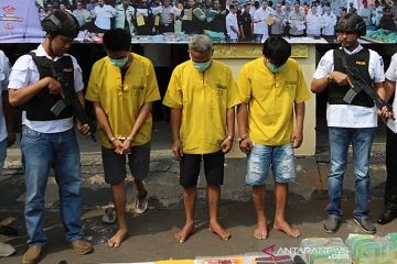Sejumlah tersangka dalam penjagaan ketat petugas Polres Metro Jakarta Utara setelah berhasil gagalkan penyelundupan 15 kilogram sabu-sabu yang disembunyikan dalam jok mobil. ANTARA/Fianda Rassat/aa