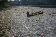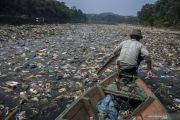 Warga menggunakan perahu untuk memilah sampah plastik di aliran Sungai Citarum, Batujajar, Kabupaten Bandung Barat, Jawa Barat, Rabu (26/6/2019). Menurut warga di kawasan tersebut volume sampah kiriman yang kerap menumpuk mulai mengalami penurunan setelah beberapa waktu lalu sempat menutupi permukaan aliran Sungai Citarum. ANTARA FOTO/Novrian Arbi/ama.