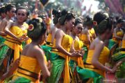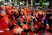 Warga menari Tari Remo kolosal pada Kirab Budaya Banjaran Mojobangkit di Kota Mojokerto, Jawa Timur, Kamis (27/6/2019). Kirab yang menampilkan sejumlah budaya kesenian Jawa Timur dan mengangkat tema Spirit of Majapahit tersebut dalam rangka memperingati Hari Jadi ke 101 Kota Mojokerto. ANTARA FOTO/Zabur Karuru/hp.