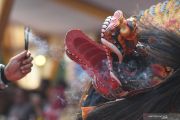 Seniman barongan beratraksi saat Kirab Budaya Banjaran Mojobangkit di Kota Mojokerto, Jawa Timur, Kamis (27/6/2019). Kirab yang menampilkan sejumlah budaya kesenian Jawa Timur dan mengangkat tema Spirit of Majapahit tersebut dalam rangka memperingati Hari Jadi ke 101 Kota Mojokerto. ANTARA FOTO/Zabur Karuru/hp.