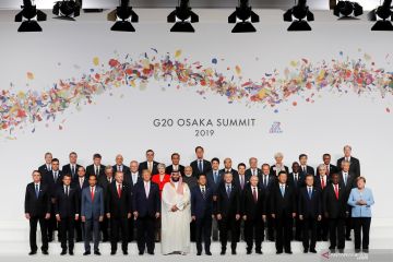 Perdana menteri Jepang Shinzo Abe (tengah) bersama pemimpin negara G20 usai berfoto bersama saat pembukaan Konferensi Tingkat Tinggi (KTT) G20 di Osaka, Jepang, Jumat (28/6/2019). ANTARA FOTO/ REUTERS/pras.