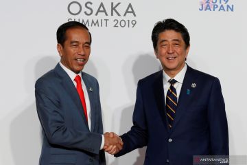 Perdana menteri Jepang Shinzo Abe (kanan) menyambut kedatangan Presiden Joko Widodo sebelum berfoto bersama pada pembukaan Konferensi Tingkat Tinggi (KTT) G20 di Osaka, Jepang, Jumat (28/6/2019). ANTARA FOTO/ REUTERS/pras.